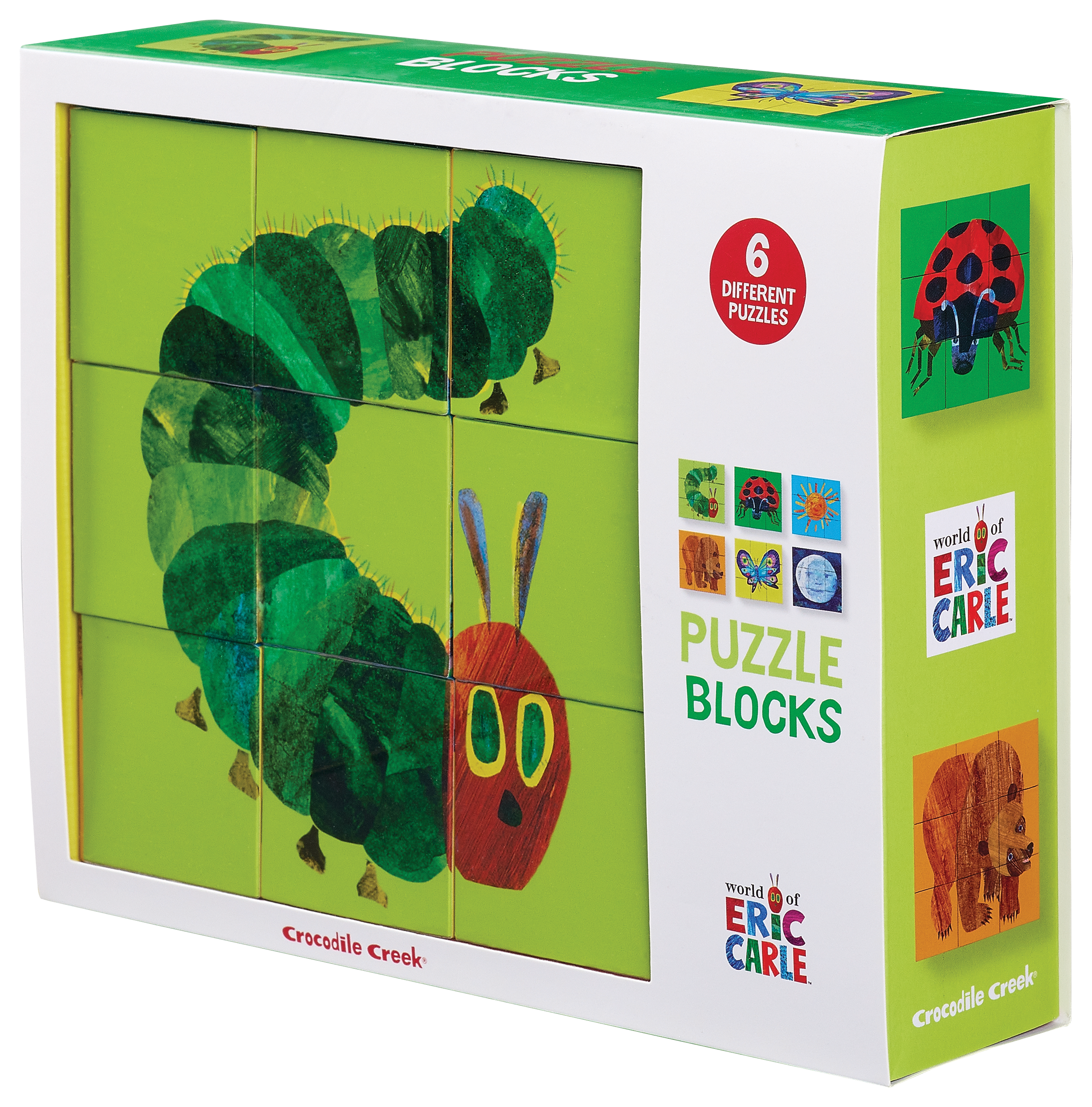 Mix, Match, and Create with The Very Hungry Caterpillar! Bring Eric Carle's beloved storybook world to life with this set of 9 puzzle blocks featuring iconic artwork from The Very Hungry Caterpillar. Each 2.5" heavy-duty cardboard block is beautifully illustrated, allowing kids to mix and match to create the caterpillar, butterfly, and other whimsical creatures—or invent entirely new ones! Perfect for little hands, these blocks promote hand-eye coordination, fine motor skills, and imaginative play. Made from sturdy cardboard and printed with soy-based inks, they're designed to withstand enthusiastic stacking, matching, and storytelling.