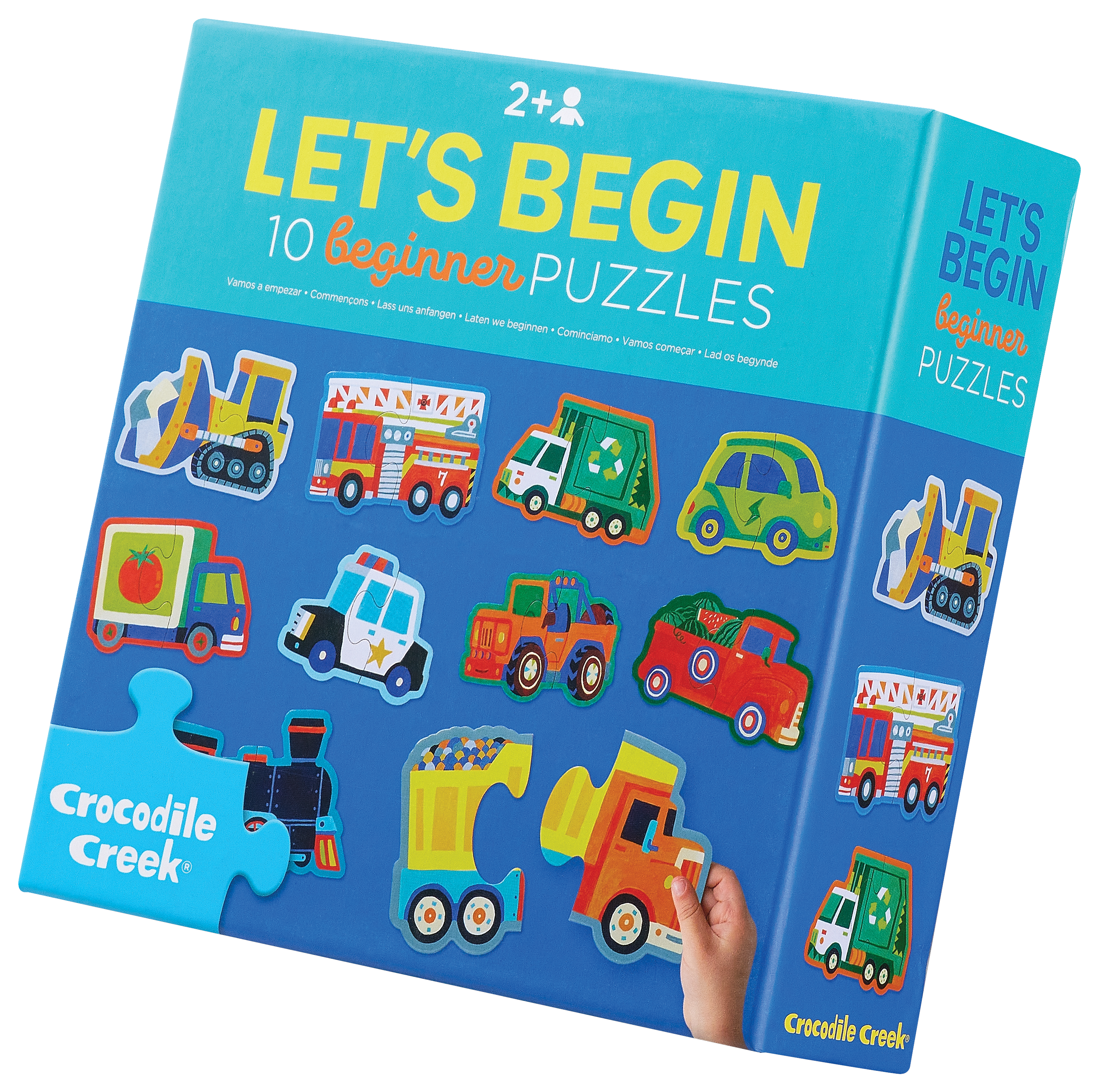 Crocodile Creek Let’s Begin puzzles are perfect for a toddler’s very first learning experience! Each puzzle set is cleverly packaged in a sturdy box. Each box holds ten (10) 2-piece colorful puzzles. Each puzzle, when completed is approximately 4” x 6”. All puzzles pieces have colored edging on front side that will help them complete the puzzle but will also allow them to learn their first colors. If puzzles are flipped on the backside, they can quickly start to match up pieces in a reverse fashion.