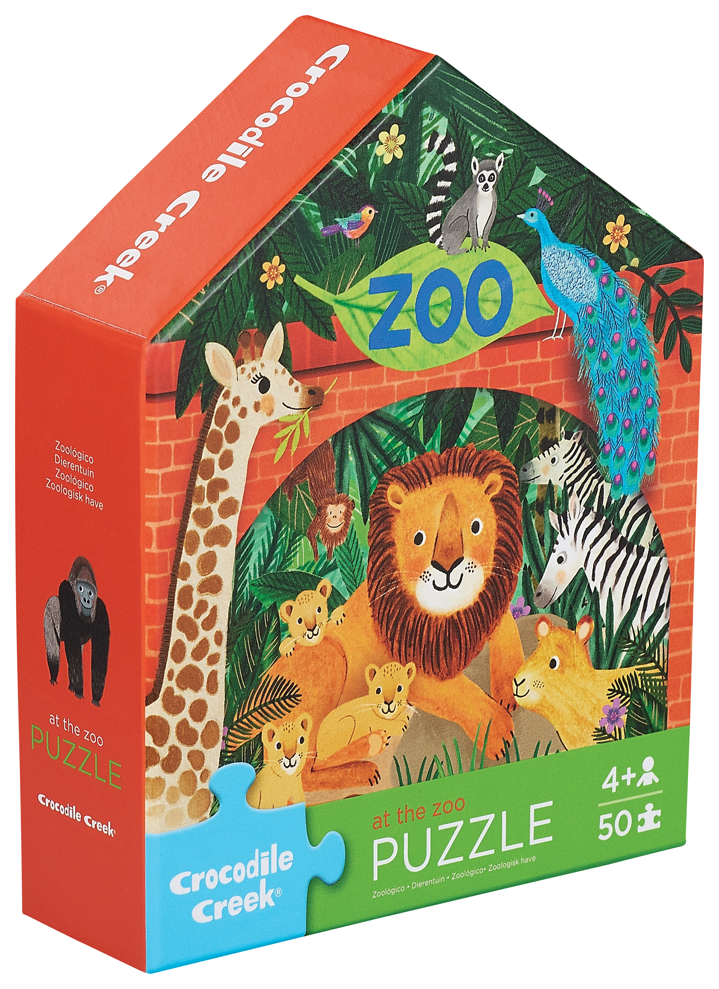 Wild adventure awaits! Our 50-piece Zoo puzzle in a house-shaped box will delight any little animal lover who dreams of exploring the zoo. Featuring bold colors and whimsically illustrated animals in their habitats, this puzzle encourages hand-eye coordination and problem-solving. Great for interaction between a parent and child that can be used over and over. A sturdy house-shaped box makes for easy storage and its small size is perfect for travel.