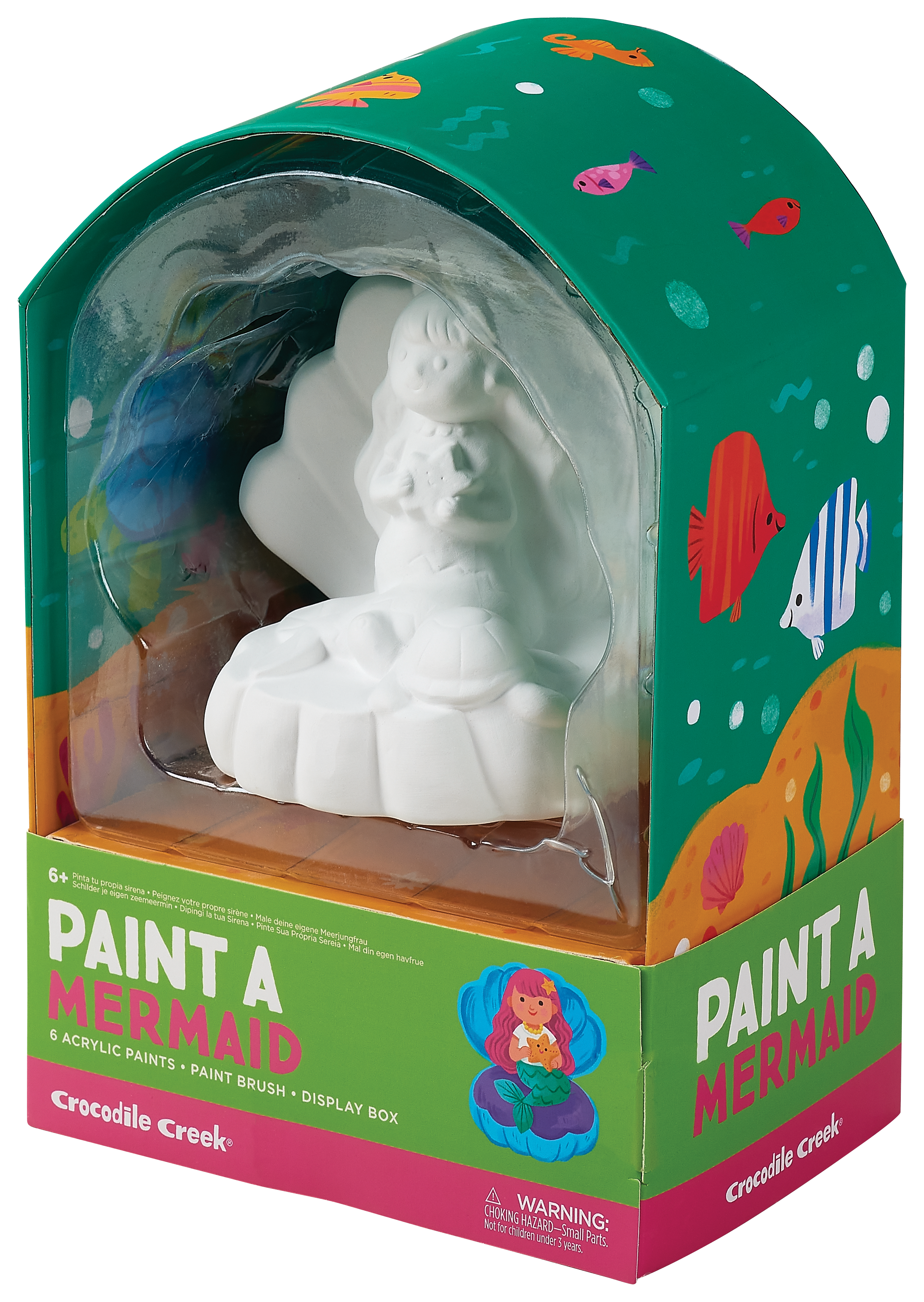 Unleash your child's inner artist this winter with the Paint a Mermaid set! This whimsical kit includes a ready-to-paint ceramic mermaid, eight vibrant acrylic paints (including two metallic colors!), and a paintbrush. Kids will love personalizing their own underwater friend with unique designs and colorful patterns. It's a wonderful year-round activity that encourages creativity and provides a beautiful, handcrafted decoration to display with pride.